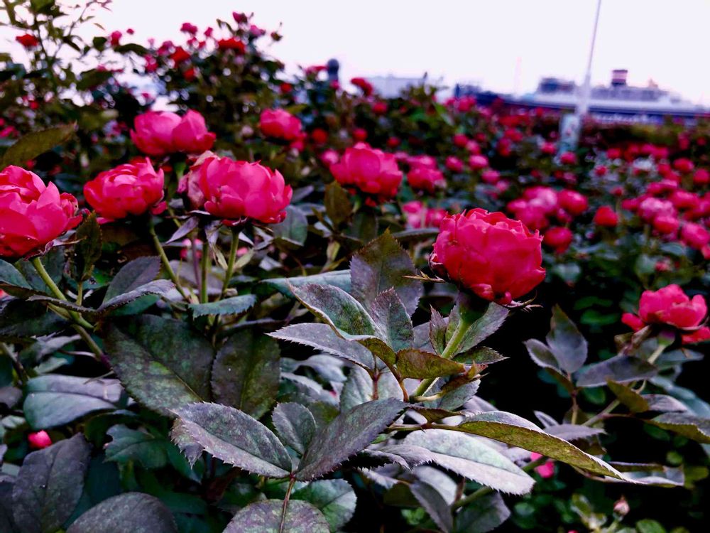 横浜港の手前を彩る赤いバラ。