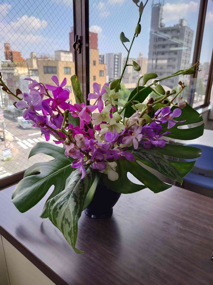 昨日出張先より帰ってくる途中で大雨に降られ雨やどりのつもりでなじみの園芸店で切花を購入。1束110円でしたので2つ買って飾りましたよ。デンファレがいろいろ入ってました。南国風テイストですね。