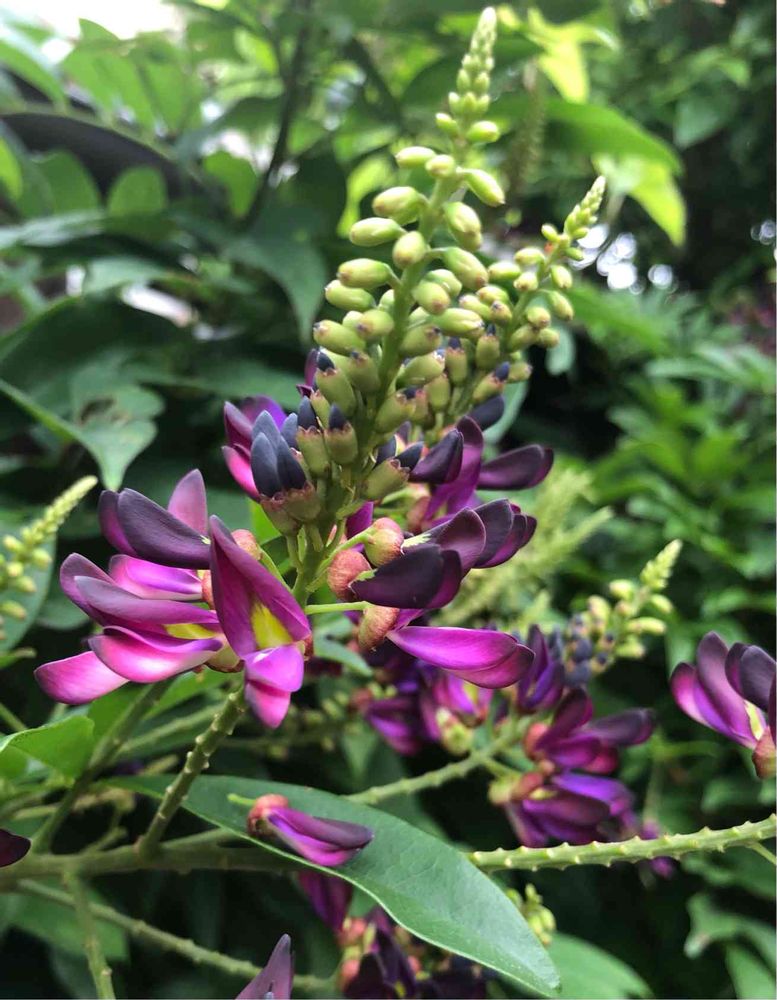 おはようございます。あさの散歩道。植木の間からムラサキナツフジが咲き始めていました。サッコウフジとも呼ばれるそうです。