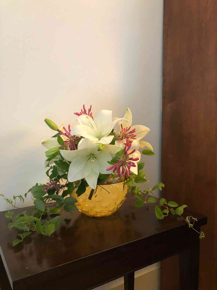ハッキリしたポコポコのある黄色いお花器、面白いですね。ユリの間からハニーサックルがのぞいて楽しげです。