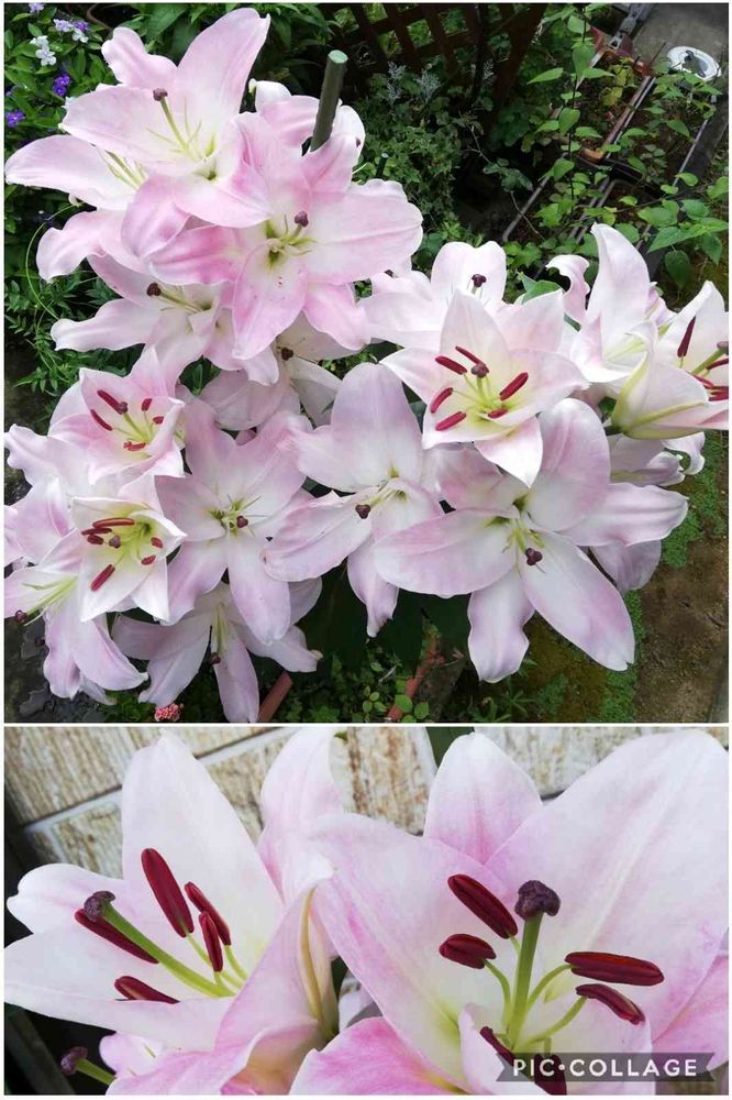 「ピンクカサブランカ」という名前の球根で購入から3年。実際、カサブランカは白花を指すそうですが、花径はカサブランカ大、1輪が20cm近くあります。最初の1輪目の花びらはお疲れ色になってしまったので取ってはありますが。