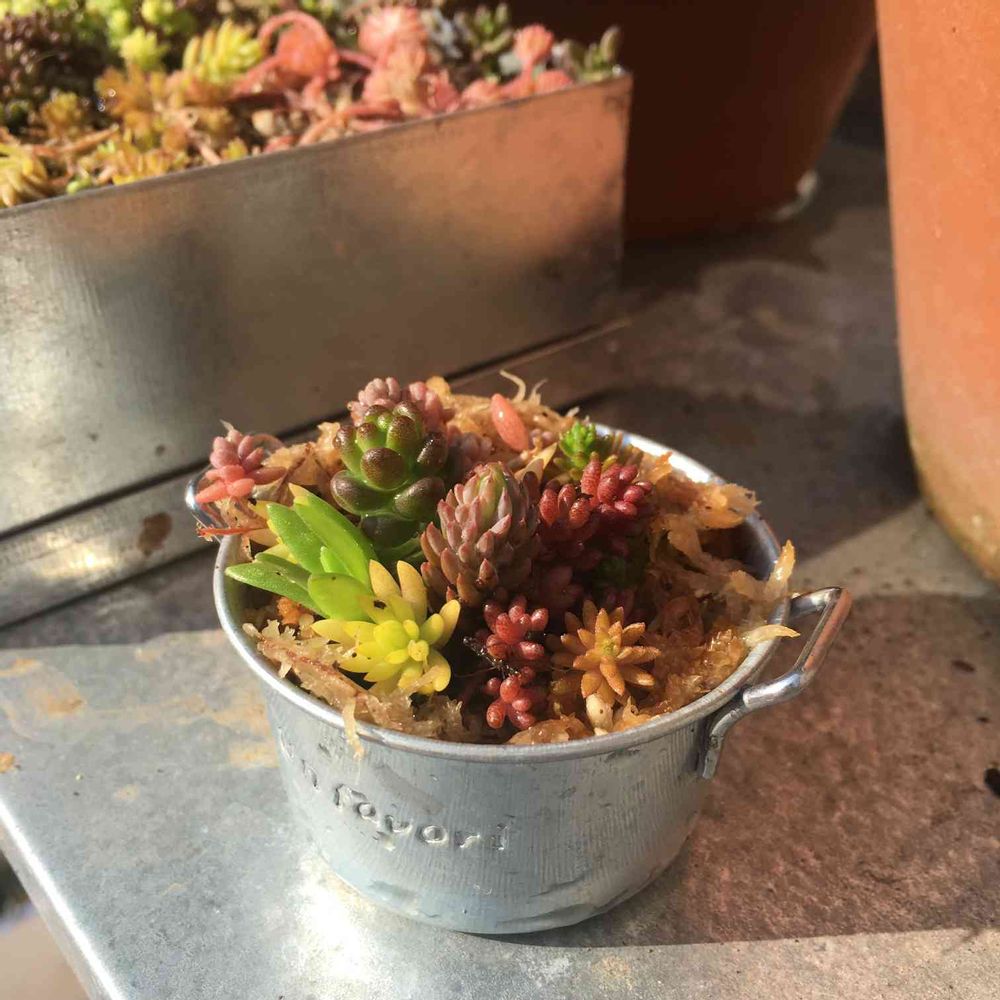 セリアのミニミニバケツにセダム盛り。。小さいのにちまちま盛るのハマるなぁ。。