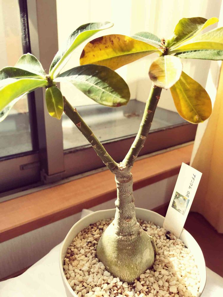 うちのアデニウムさんも1つは葉っぱみんな落ちちゃったけど、もう1つは黄色になっても落ちてないんだよ🤔💦