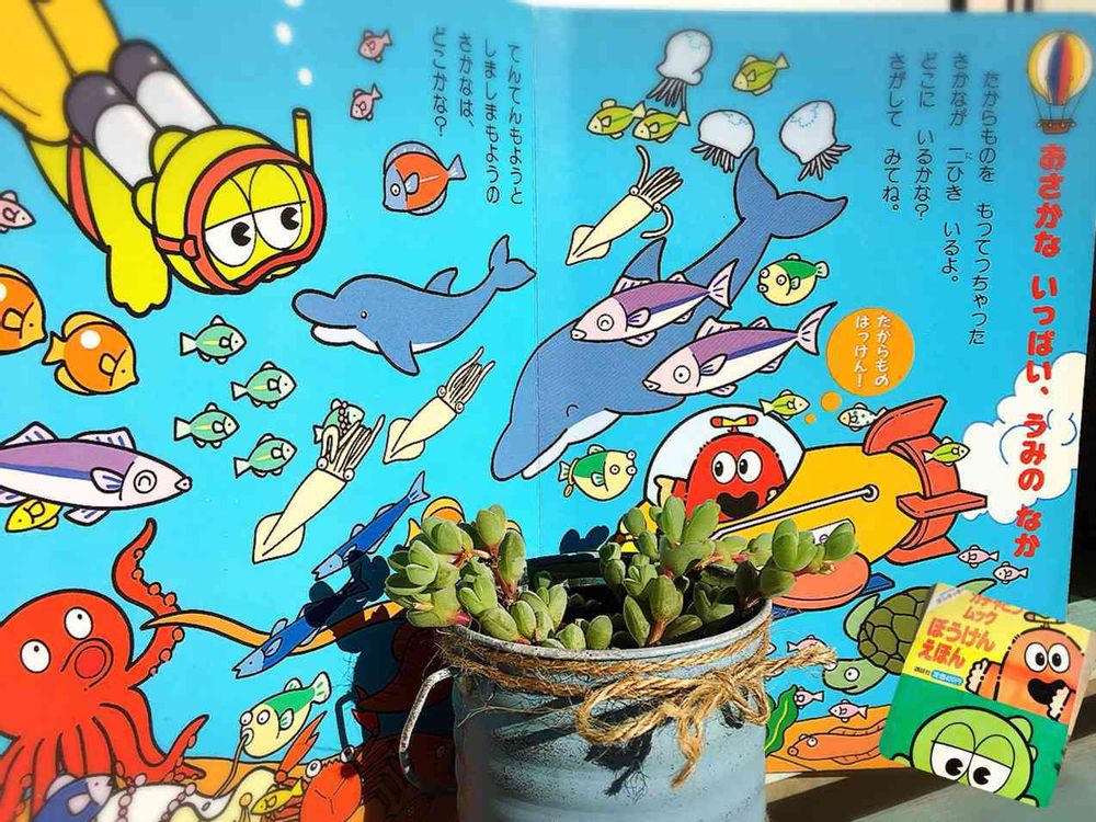 トトさん🐟にバックのガチャンピンとムックの絵本💓絵本の世界🌊🐬🌊と合ってるね