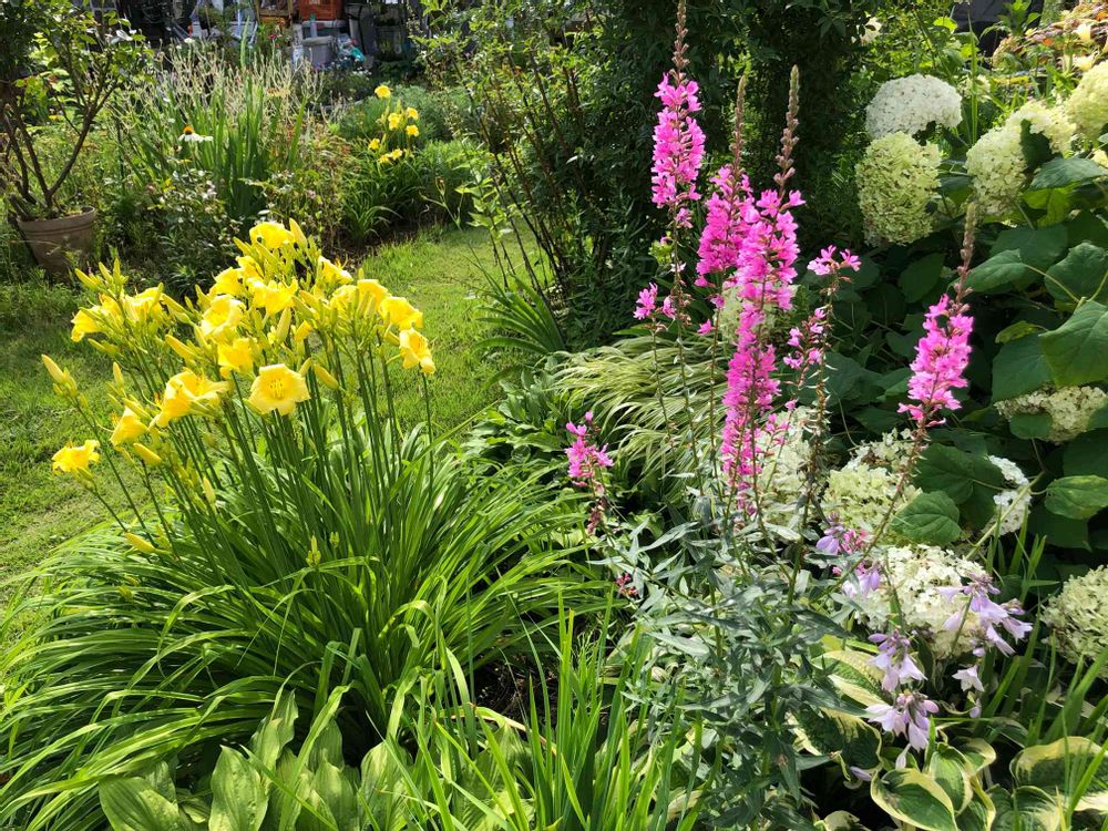 直径1メートル程まで葉を広げたチャボカンゾウの🟡の側にピンクのミソハギ、その足元に薄紫色のギボウシの花も咲き始めました☺️