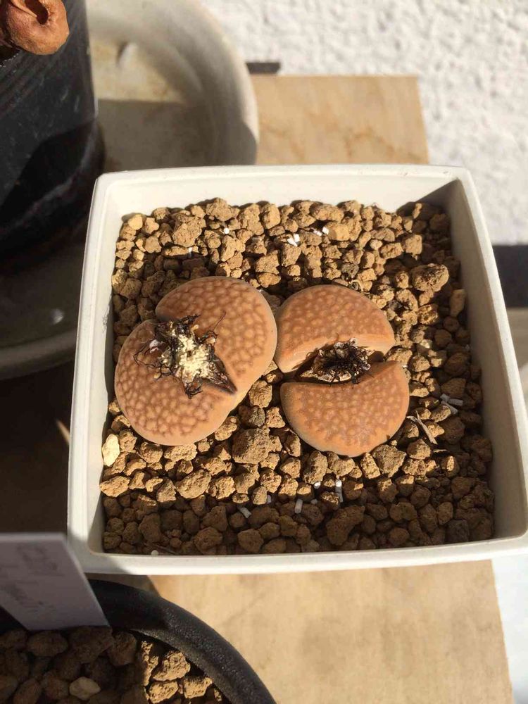 島忠で購入したリトープス。花が終わると花弁は焦げたようにチリチリになりました。両方とも脱皮が始まるようです。