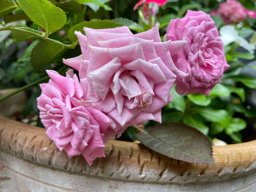 この時期の新苗のお花なのでミニバラのようです。ラベンダーピンクのかわいいお花です。