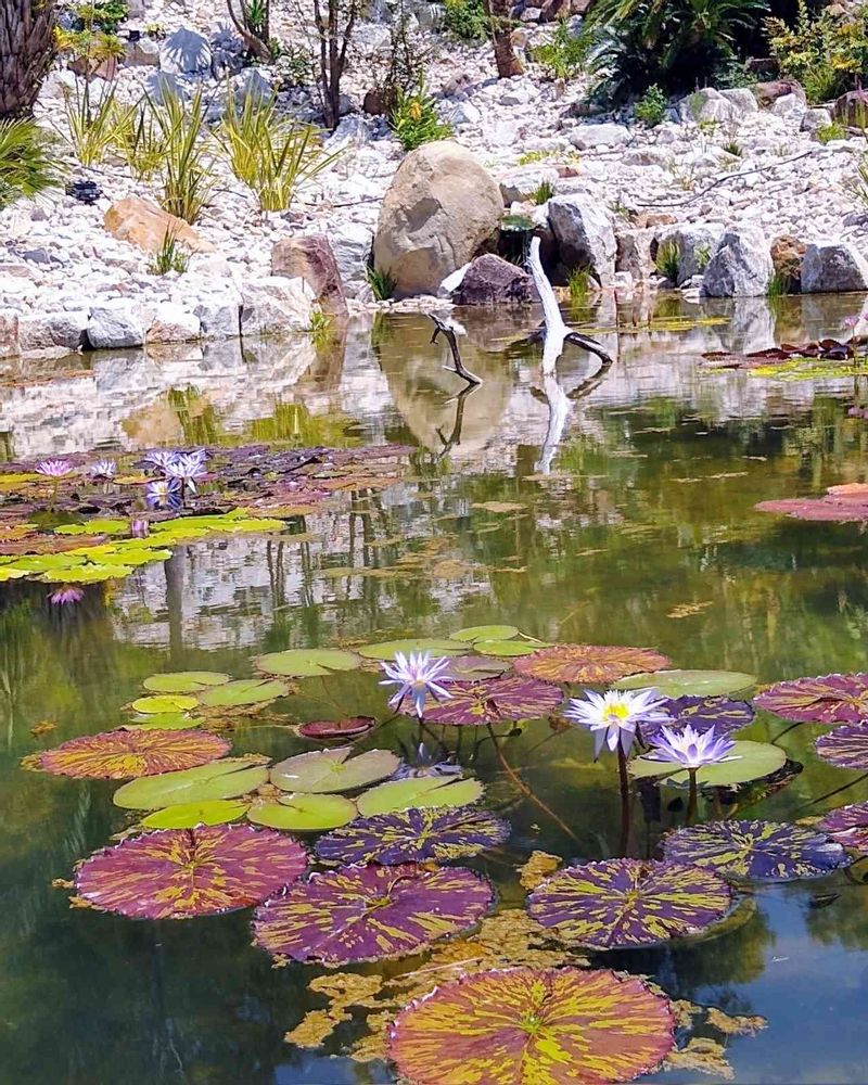 ブルーのお花も美しいですが、葉っぱの色合いがおしゃれ、水面に映る光も幻想的でウットリしてみています💞