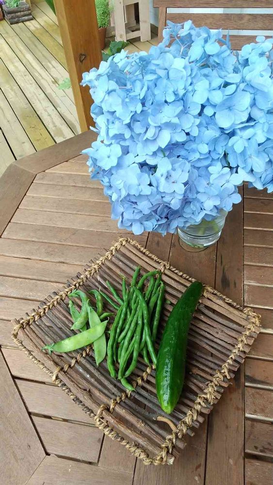 今朝の収穫と、テーブルに飾ってる紫陽花🌼✨
