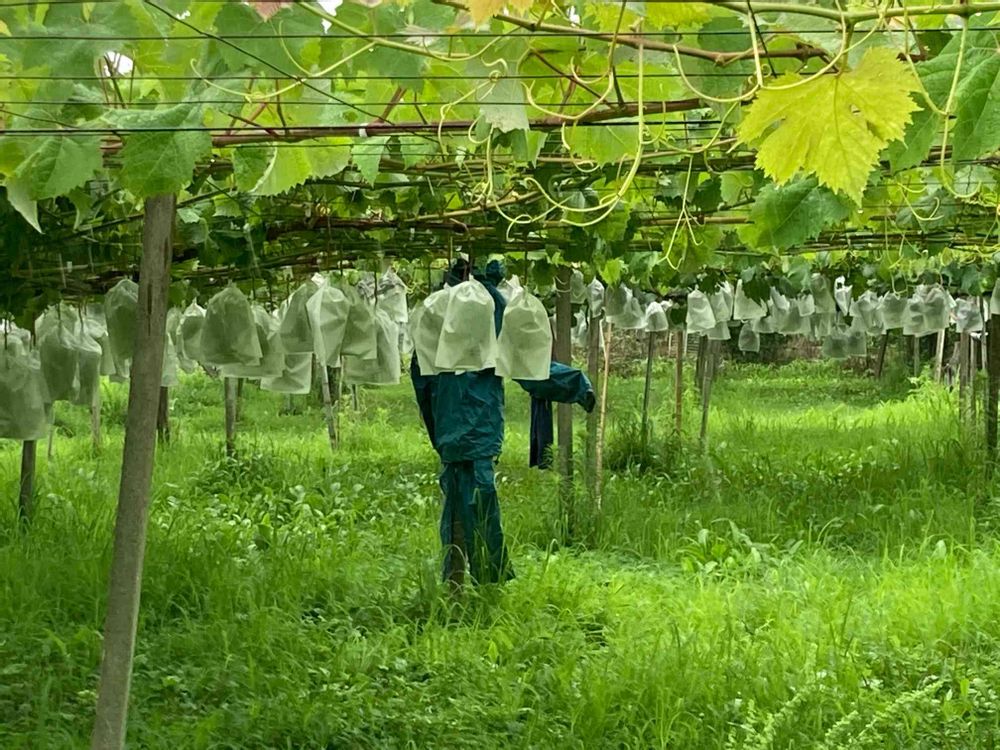 明日からにも梅雨明けかと思っていた今朝、となりのぶどう園🍇を覗くと、、、