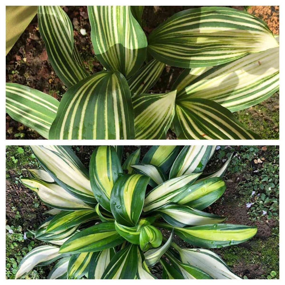 上の斑入りドイツスズランは葉色に変化はないんですけど、下のホスタ・レインボーズエンドは新葉の斑は緑がかります👀