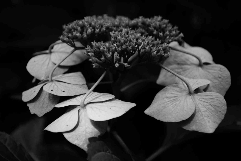 ガクアジサイの花後、まだまだ楽しませてくれます。7月11日Nikon一眼レフで撮影📷️、スマホでモノクロにしてみました。