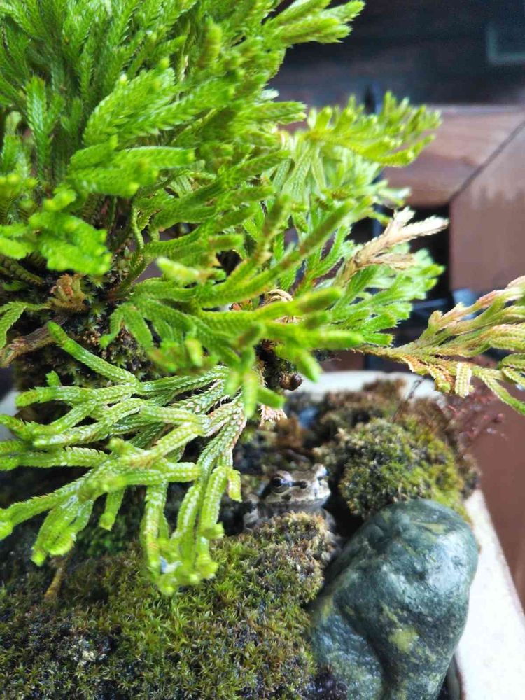 さん おばんです❗️苔は水もち良く、ヒバも保水力あり、蛙🐸朝晩水かけたら、目がうるっとしてくれます。真夏はビッキ(🐸)水舞(待)ってます🙇