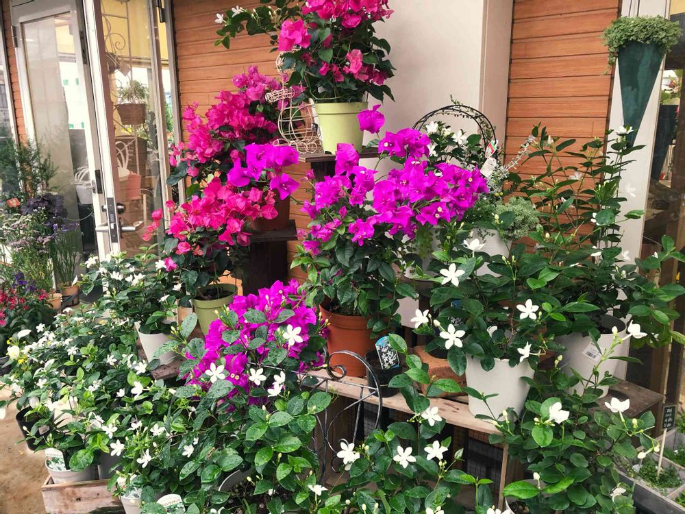 最近、元気の出る明るい色の花が人気です✨ヒマワリやハイビスカス、ブーゲンビレアや、真っ赤なつる性のディプラデニア、真っ白なセイロンライティア🌻🌺