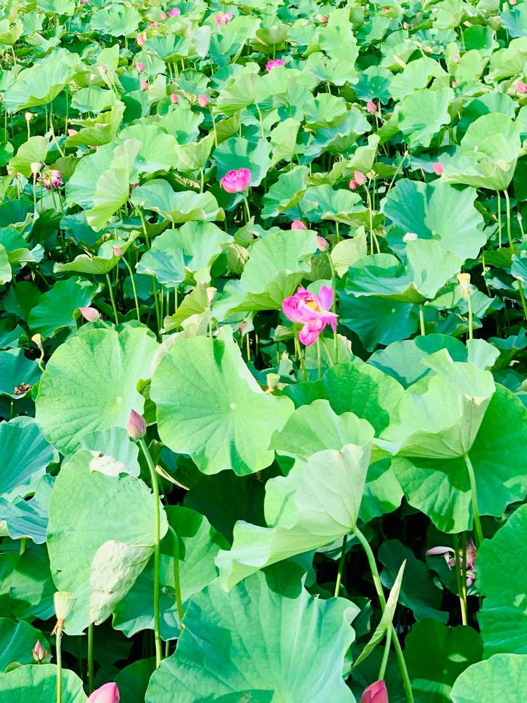 ハスの葉っぱの緑色が綺麗で、眩しい〜。花も素敵ですね。