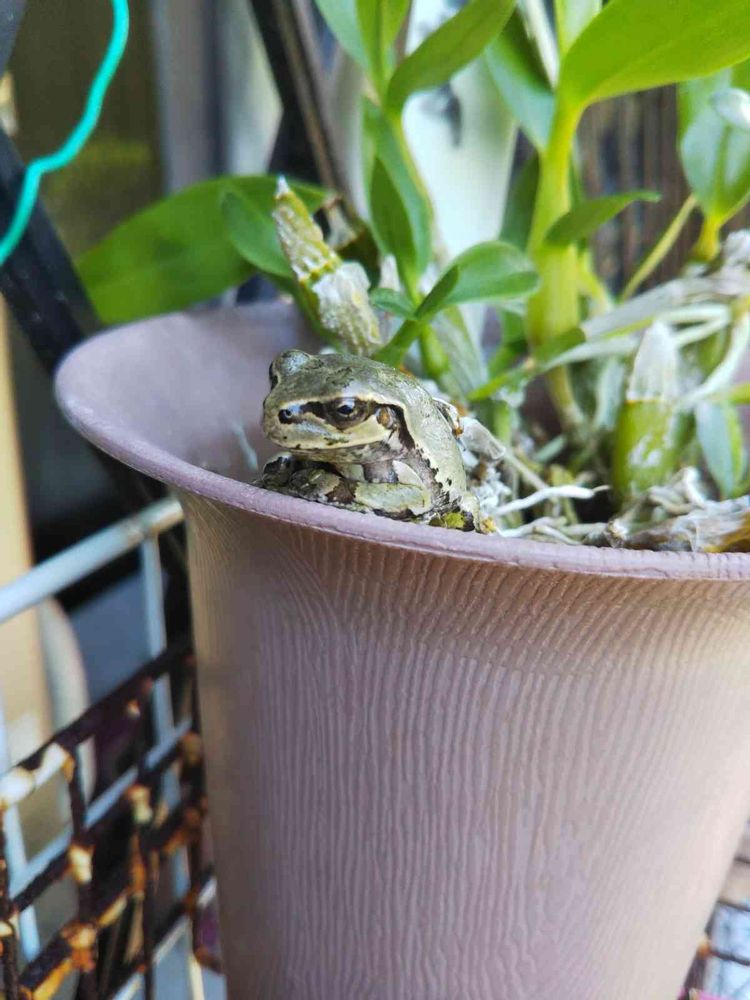 暑かった、ひらかびる(乾く)ところでした。👴は一度も咲かせてないオンシジュームと、水がほしいアマガエルです😓水やりまで後五時間😞あります。🐸動かない😓
