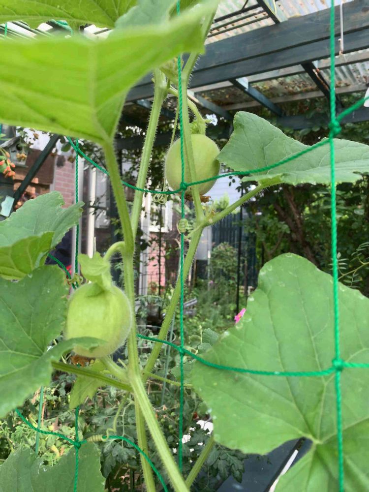 メロンの空中栽培始めて3年目になりますがだんだんコツがわかってきて今年も無事、人工受粉成功しました😄でも調子に乗りすぎて沢山、実をつけてしまったのであとで間引きします。ちなみに昨年より1週間位、早いかな?今年はうどんこ病もハダニ被害もなくすくすく大きくなってますがやはりカメムシが集まってきます😢