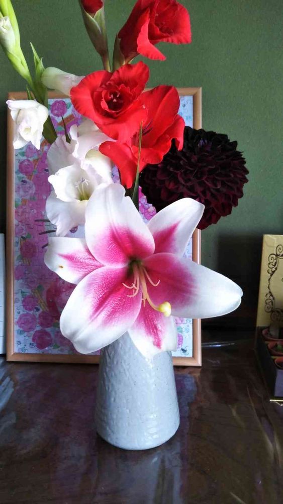 今年のピンクの百合です。今年は、不作でした。🐛食いだらけです。❤️と💕のグラジオラスさん、🖤いダリアさん、自前の花で〜す。