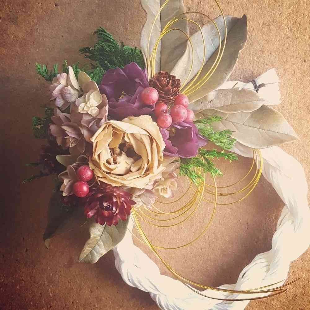 ~ドライフラワー バラとサザンカのシックなしめ縄飾り~