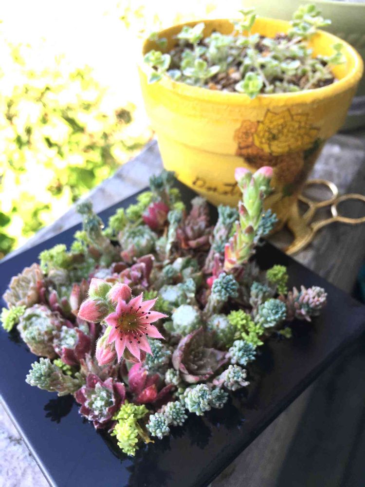 黒のフレームの寄せ植えは、センペルで多肉植物です💕ちょうど真ん中下の所にピンク色の花✲*゚が咲いていますよ(⁎ᴗ͈ˬᴗ͈⁎)