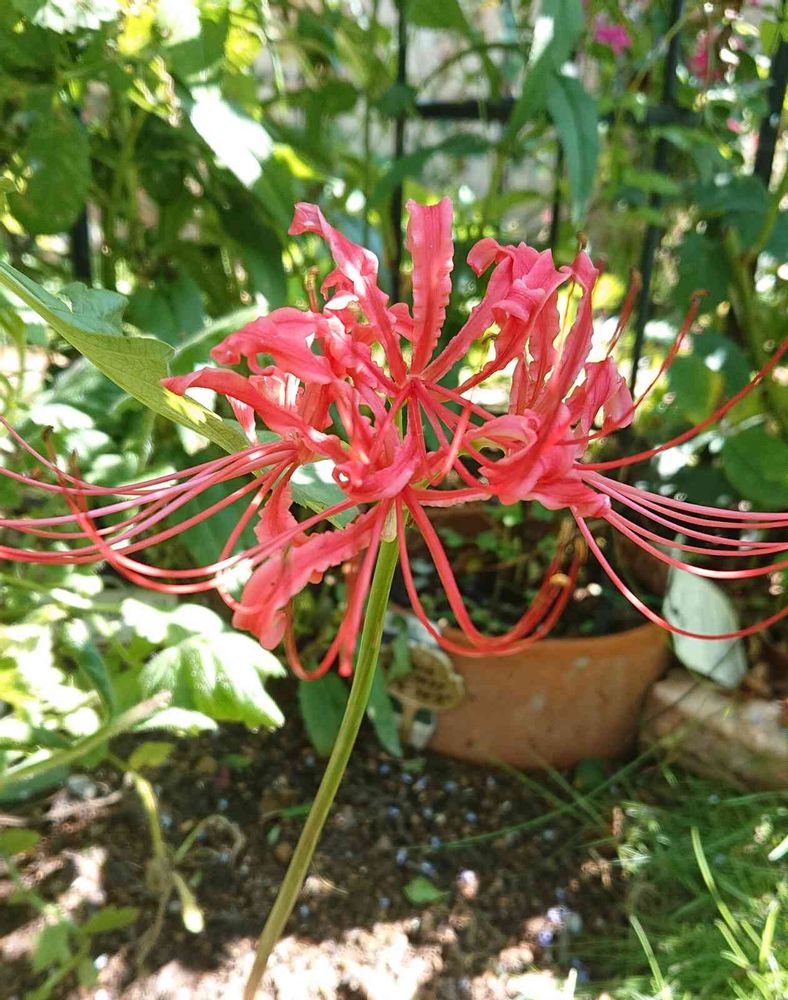 伸び伸びで倒れかけてたダリアを整理したら、オレンジ色のリコリス⁉️ 咲いてました😂 ちょっと早くない⁉️