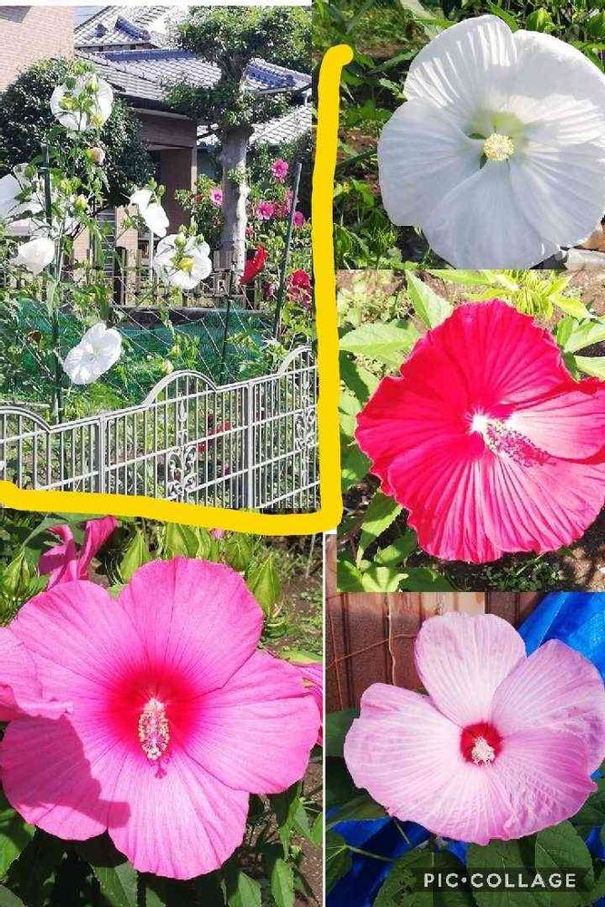 ワクチン接種に行った帰りに見付けたあるお宅のお庭に、アメリカ芙蓉の大輪の花、写真右側の3色が沢山咲いて居ました。我が家のアメリカ芙蓉とスケールが余りにも違ったのでお声掛けして、写して来ました。