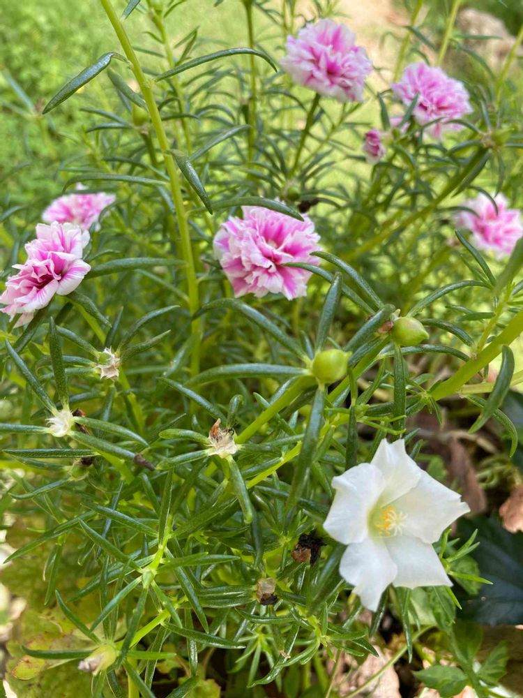 八重咲きのマツバボタンに混ざって、真っ白な一重のマツバボタンさんが🧚♀️