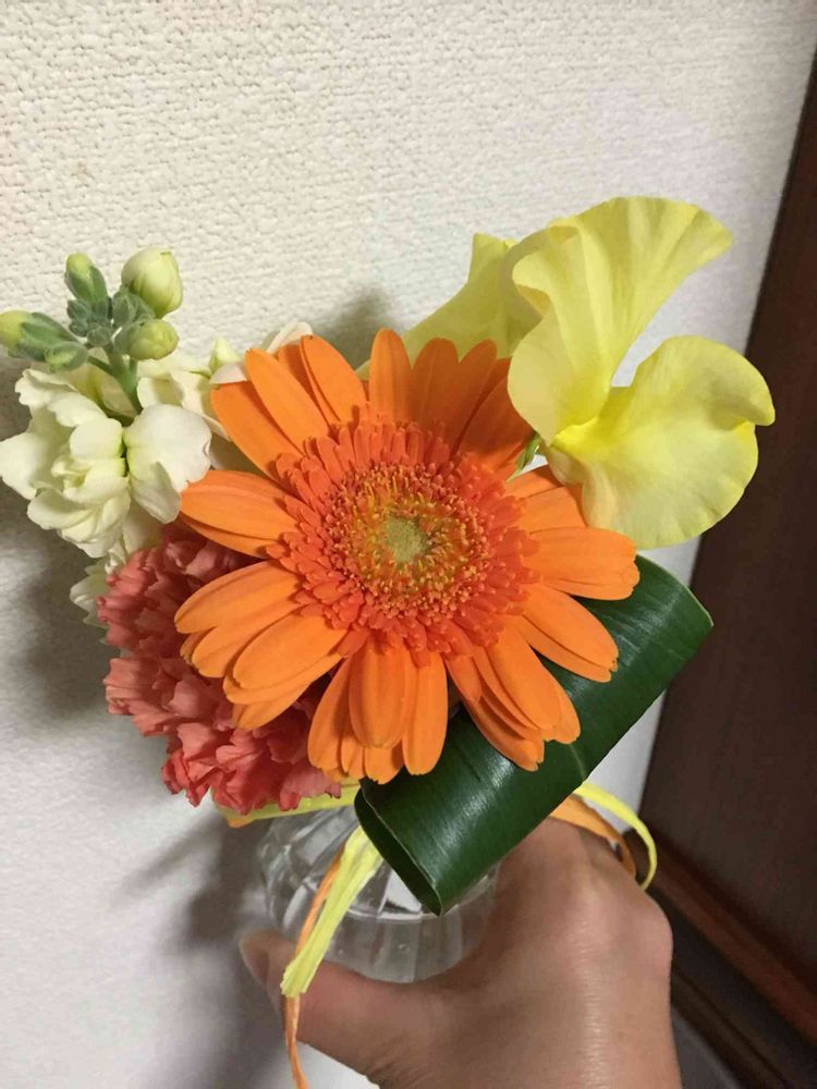 オレンジのガーベラも黄色のスイートピーも可愛い〜ʚ♡ɞ(ू•ᴗ•ू❁)💓