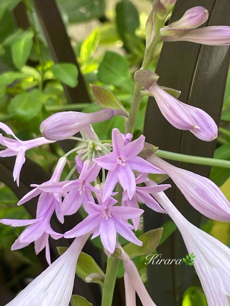 小さな星のような薄ピンク色の花 ツルバキア シルバーレース、薄紫色の花のホスタ フランシー どちらも大好きな斑入り葉の花です。 半日陰が似合う清楚な花達です