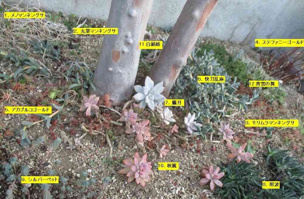 草系セダムは、シルバーペットやアカプルコを残して消えたけど、朧月や秋麗などは、雪が降らず、乾燥しているためか、葉肌が凍結で傷つくこともなく、未だ元気。