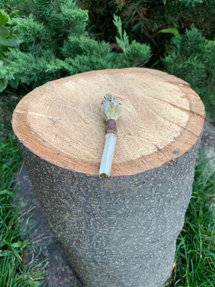 腰掛け用に切ってもらった30cmくらいの丸太と花殻