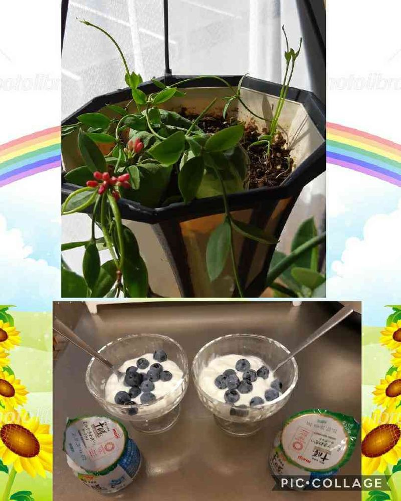 今晩は🌃😃大分北部も、梅雨明けしましたが、今日は夕方近く迄雨☔が小降りながら降ってましたが、4時過ぎには、晴れて、夕焼け🌆に、なりました。今夜は、保育園での初めての、お泊まり会で、私達は、子守りはお休みでしたが、夕方から晴れ☀️て、今頃は、楽しい行事で、はしゃいで楽しんでる事だと思います。晴れて良かったですね。我が家の、カンガルーポケット…ようやく、新芽が伸びて来ました✌👍💕。また、連日、ブルーベリー、主人が、甘いの~ぅ😋と、粒のまま、ヨ-グルトにいれて食べてます😋💕初めて作りましたが、甘くて、最高です😌💓。ジャムに、しなくても十分に甘いですよ💓😃😋。🍀😌🍀。召し上がれ💓😋。