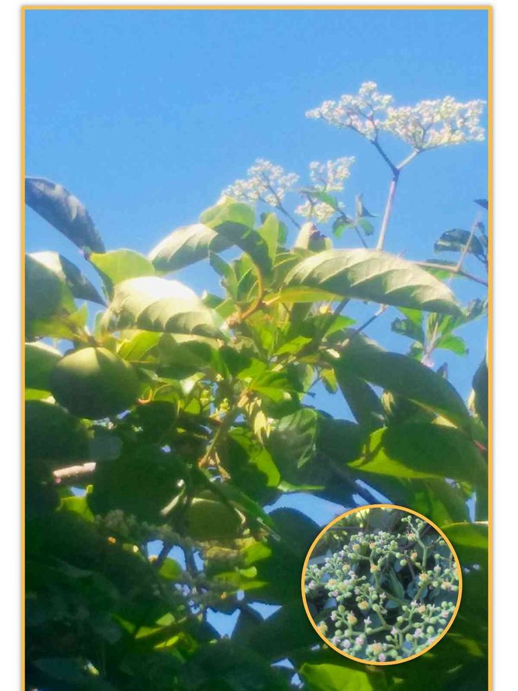 実家の柿の樹を見上げたら、「んん?柿の花?」と青空に向かって咲いている花を見て、何だか柿の花にしては見たことないぞぉ~🤔と良く良く辿って見てみたら、隣に生えていた「ヤブガラシ」の蔦がずっと樹の上の方まで伸びていたのでした😅