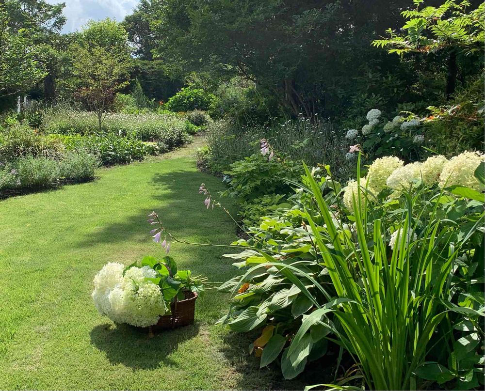 綺麗に手入れされた柴に、アナベルの白が映えますね。