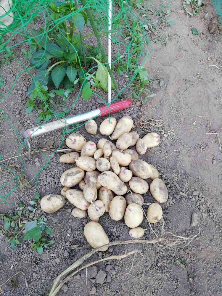 複雑な心境のじゃがいも🥔なんです。鹿の被害で茎を引きちぎられ、成長できないので、仕方なく掘った芋🥔です。