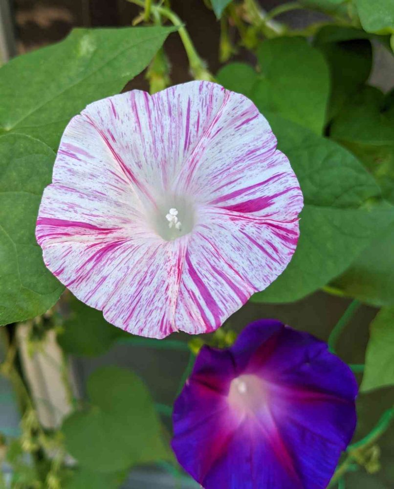 💓朝顔はベニスピンクという西洋朝顔で私の江戸風情は💜です。両方共初めて植えたんですがどれも違う顔で楽しいですね✨