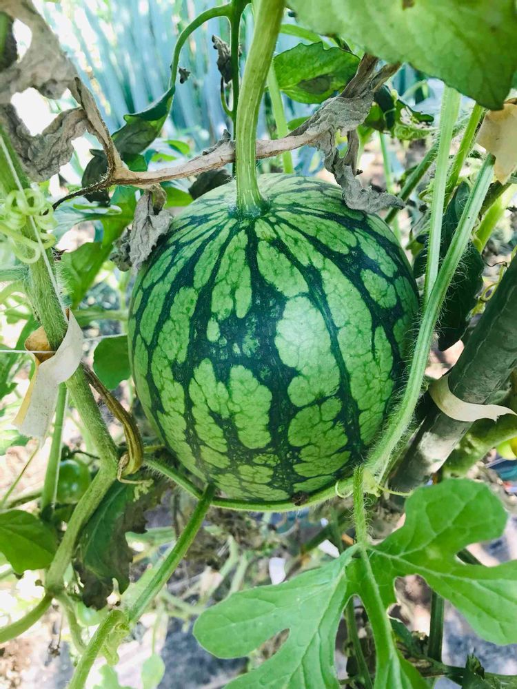 鳥、ハクビシンに食べられるので去年から空中栽培にた小玉スイカが順調に成長してます👍