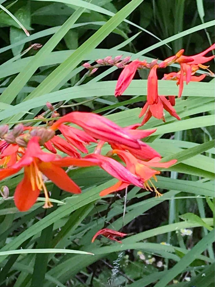 走るように伸び、たくさんの葉をかいくぐり、檜扇水仙の茎は緋色の気持ちを花に運びます。