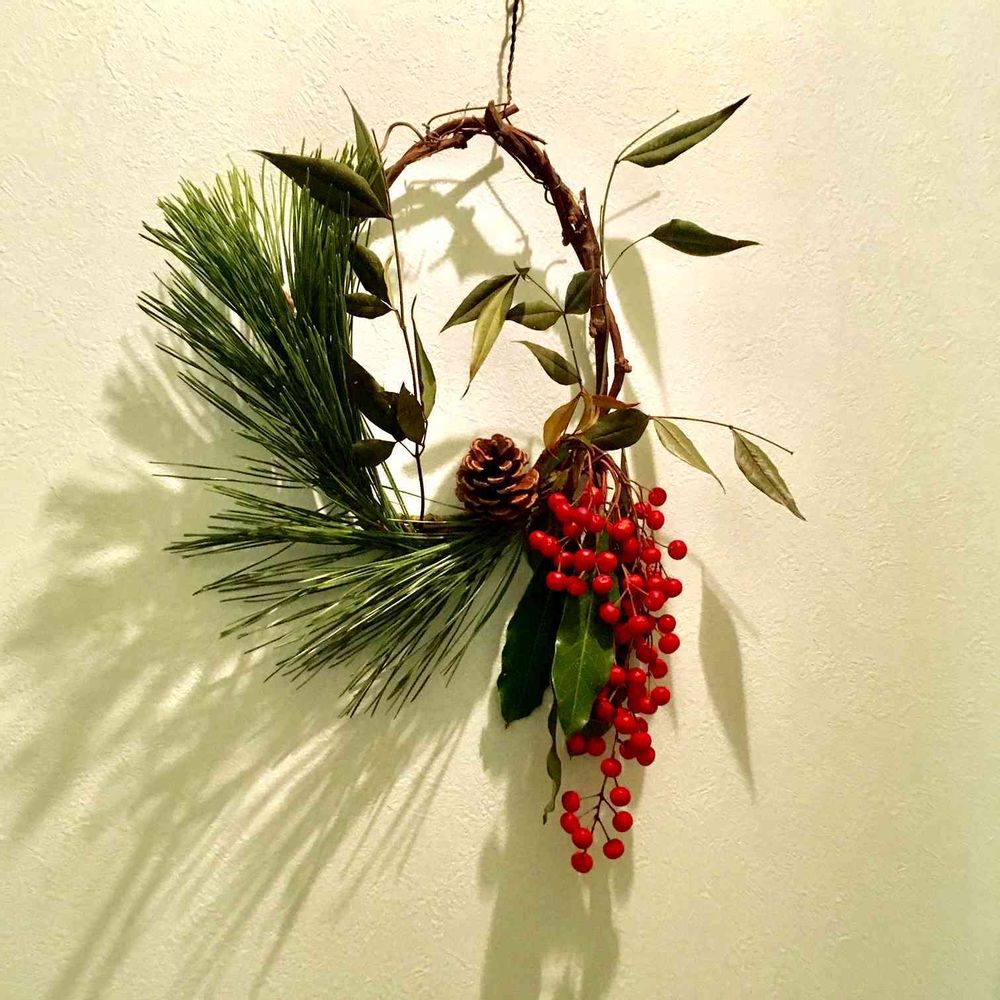 父が作ってくれた正月リース、外にかけていたら強風で南天の実がなくなってしまって無残な姿。