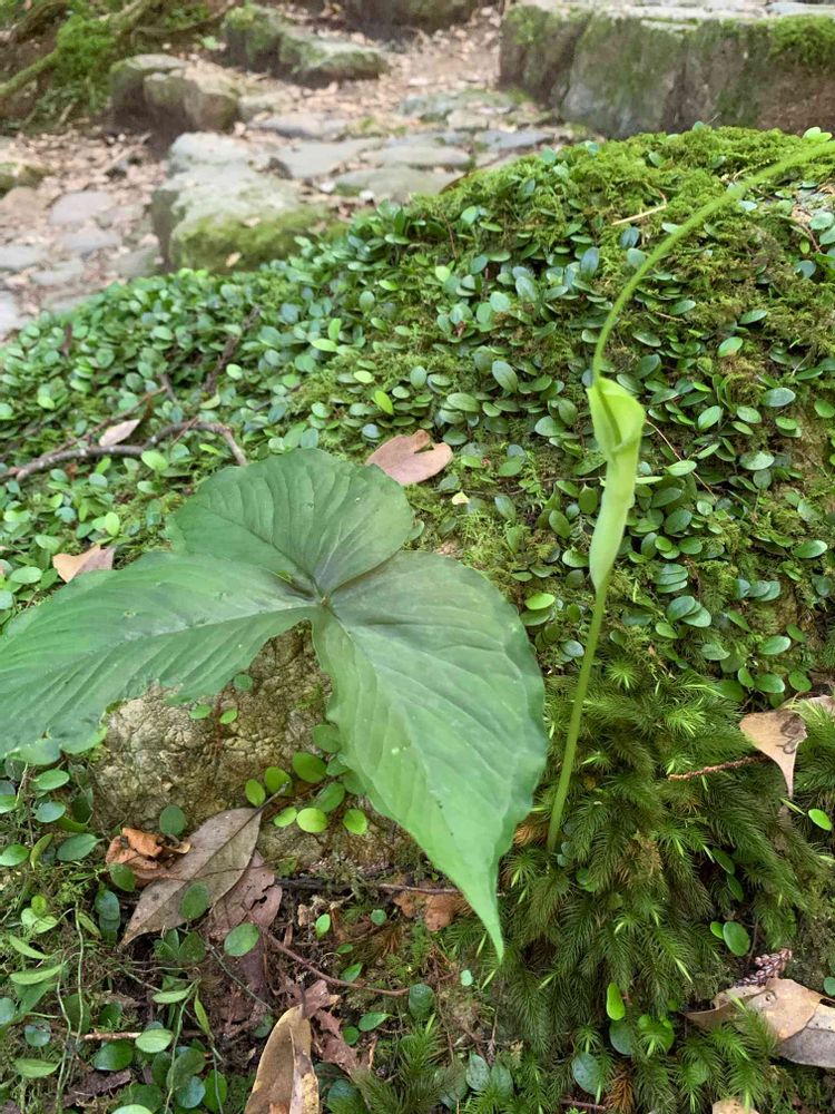 3枚の大きな葉はムサシアブミ。右がカラスビシャクかもしれません!!