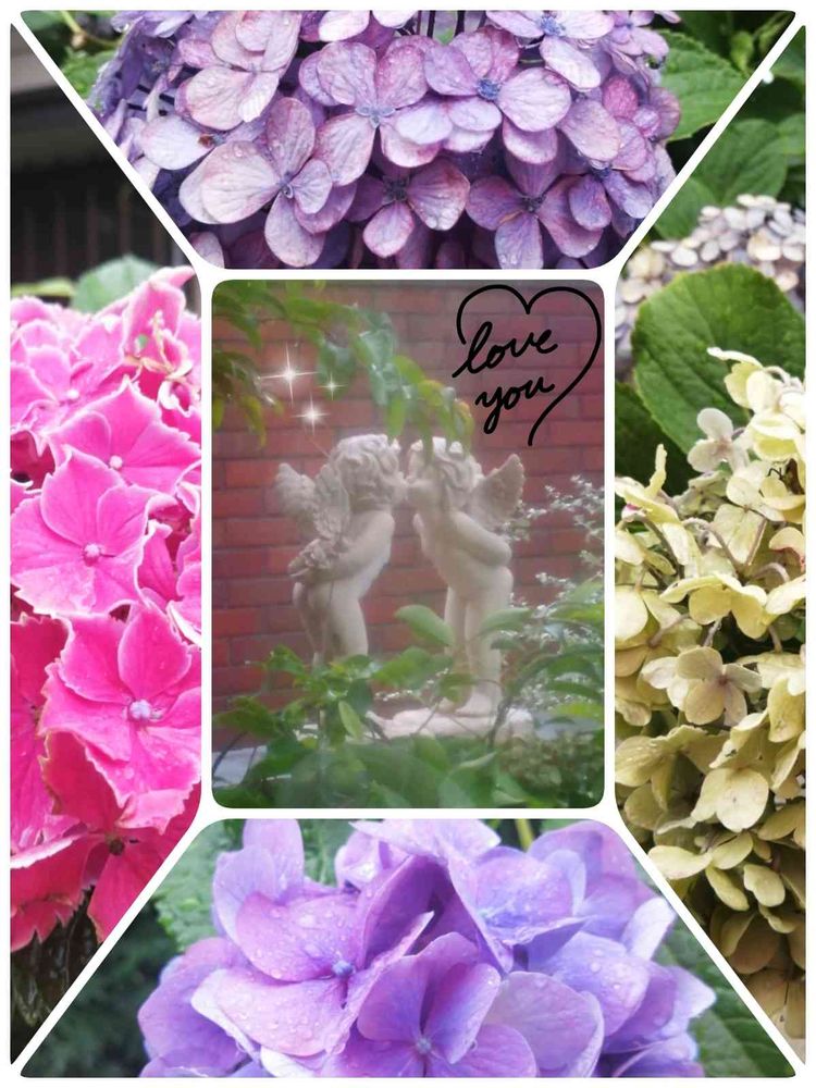 さん♥こんにちは〜ちょっと前にご近所さんで集めた紫陽花picにレストランのお庭で💋してたエンジェルちゃんを🤭🤭🤭💕可愛いkissですね✨🥰