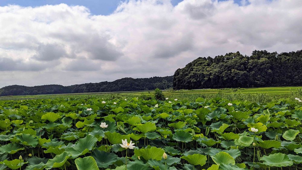 蓮田の脇道を歩くとカエルがビックリして蓮田へ飛び込みます。キャンという可愛らしい鳴き声とともに上手なカエルは水面を3〜4回水切りしてから水の中へ消えていきます🐸🎶