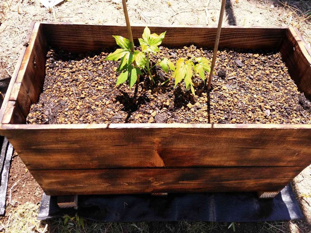 すごく根が張るので、大きな鉢が必要なので、リンゴ箱をもらってきて、表面をバーナーで炙って炭化させて、木が劣化しないようにしました。
