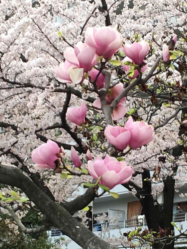 公園にて満開の桜をバックにこれも満開の木蓮。色合いがとっても綺麗です。