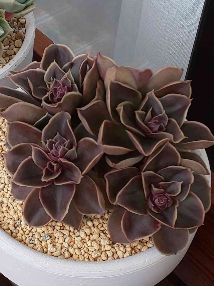 そんな不遇な2年半あまりが過ぎた一昨年の春からスイッチ入りました🎶この年は暖冬だったんですけど、どうも外葉が枯れるんで「夜だけ室内」で冬越し、その後の急激に強くなる春の直射に晒されたことで、めちゃくちゃ別嬪さんに🤩🙌その後の遮光できずな夏越しを強いられたんですが、なんとこれが大ヒット👍怪我の功名とでも言いますか、黒光りするほどの見事な黒多肉になったんですわ🎵まとめで2020.07.19のpicをぜひ見てください🎶