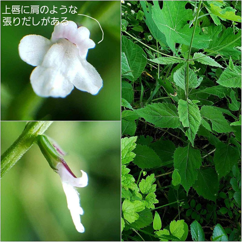 ナガバハエドクソウの上唇には肩のような張りだしがなく、葉が下方にかたまってついていました。
