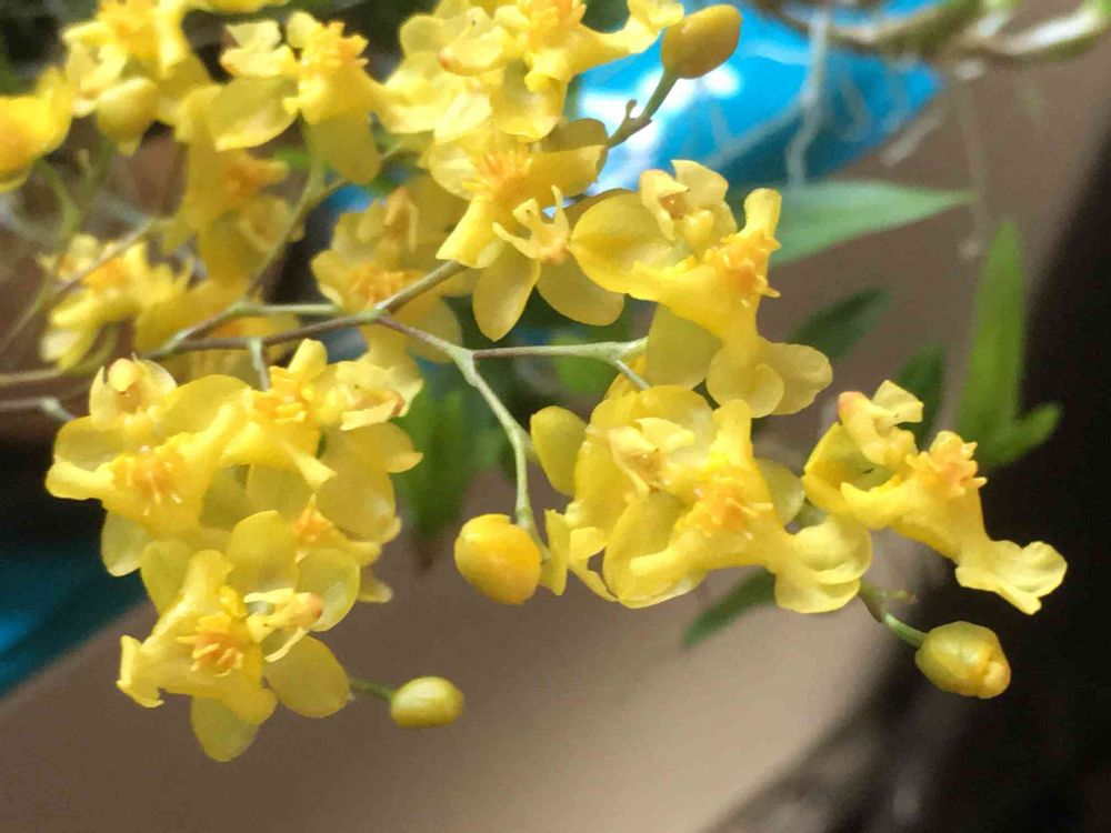 普通のフレグランスファンタジーよりも花の色が黄色いと先日GSに書いたら、やまはる園芸の@kenjiさんから、片親のオンシジウム・ケイロフォルムと戻し交配をした「ゴールドダスト」か、トゥインクルの実生ではないかと教えていただきました。