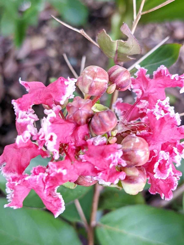お庭のサルスベリちゃんのお花が咲きました〜🎶濃桃色と白縁のフリルがお気に入り❣️꒰。•ᴗ•。໊꒱