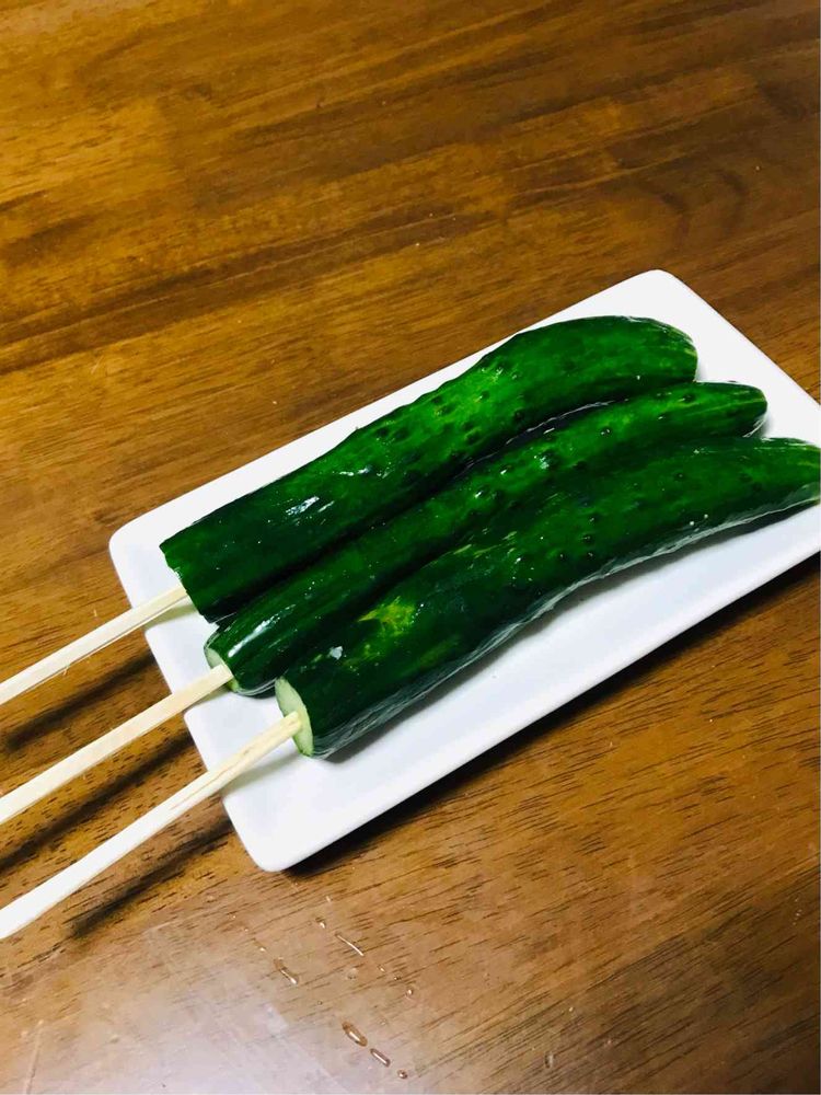 1本漬けにしたきゅうりに割り箸をさして食べやすくしたら孫達がお祭りみたいと喜んでくれました🪅🏮🪅🏮