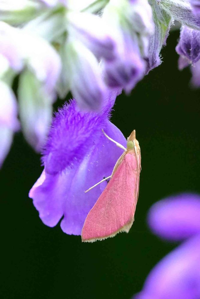 ブルーサルビアとピンクの蛾(マエベニノメイガ)